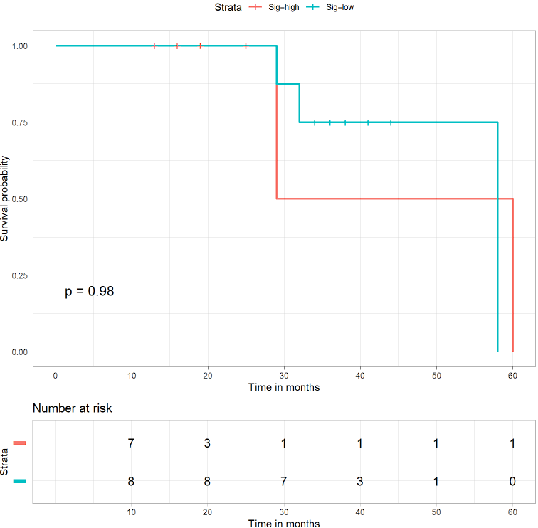 Validation of the biomarker and model was performed using the Taber et al. RNA-seq cohort. Two genes from the biomarker had to be excluded—MGC34796 due to its absence from the validation dataset and LCE3A due to zero variance, which prevented z-score standardization. The reduced biomarker signature of five genes achieved a classification accuracy of 67%, sensitivity of 77%, specificity of 50%, and AUC of 0.55. Survival analysis using the remaining biomarker signature in the validation cohort showed no significant difference in CSS between high and low biomarker activity groups (p=0.98).