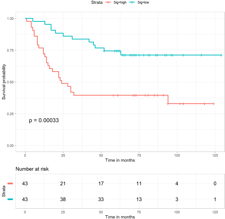 The biomarker's biological relevance was further assessed through single-sample gene set enrichment analysis (ssGSEA) and survival analysis. In the Sjödahl discovery cohort, patients stratified by biomarker ssGSEA score showed a significant difference in cancer-specific survival (CSS) (p=0.00033). Approximately 75% of patients in the low biomarker activity group survived five years (60 months), compared to only ~40% in the high biomarker activity group. These results suggest that higher expression of the biomarker genes is associated with poorer prognosis, consistent with their upregulation in NAC non-responders.