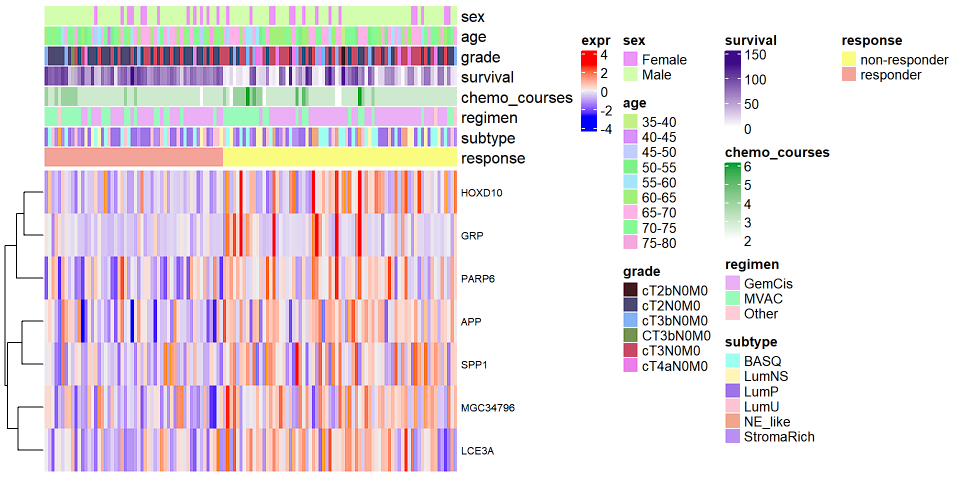 This study identified a biomarker signature comprising seven genes that were differentially expressed between responders and non-responders to neoadjuvant chemotherapy (NAC) in muscle-invasive bladder cancer (MIBC). These genes—HOXD10, APP, PARP6, SPP1, MGC34796, LCE3A, and GRP—were all significantly up-regulated in non-responder tumors. No genes were found to be significantly down-regulated.