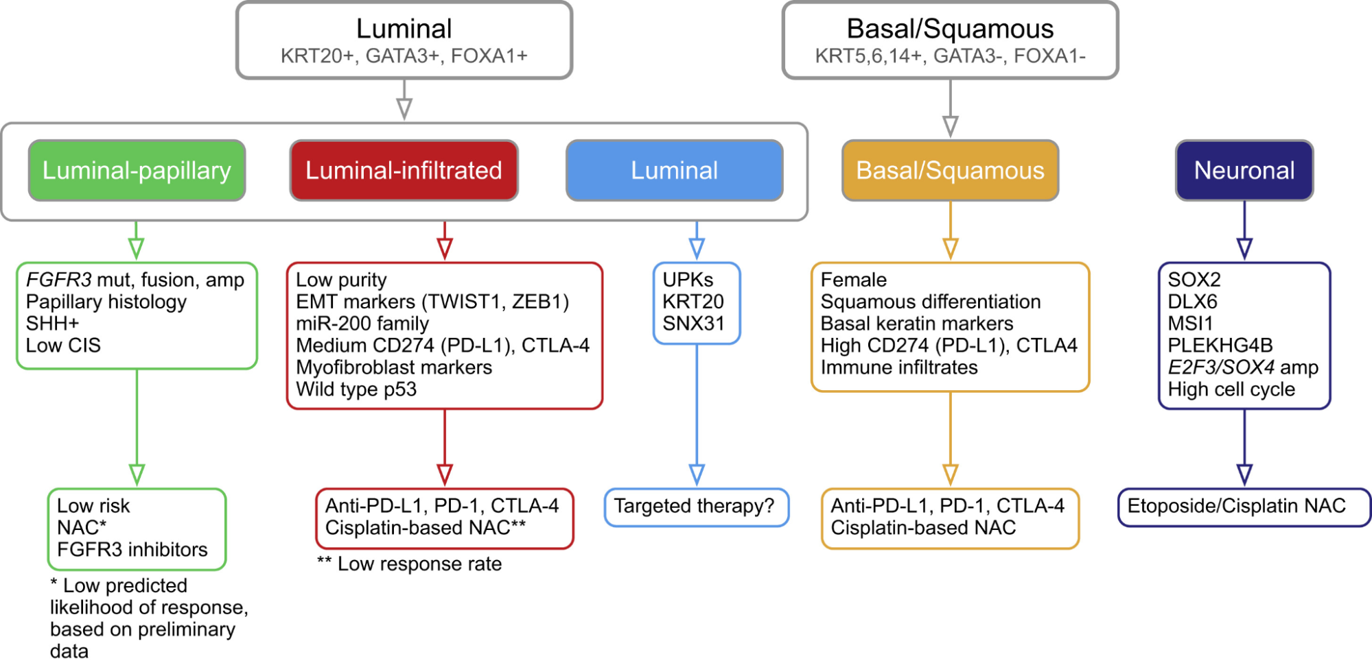 Several large multi-institutional patient cohort studies have sought to elucidate the molecular characteristics associated with NAC responsiveness in MIBC. The Cancer Genome Atlas (TCGA) researchers performed a comprehensive molecular characterization of MIBC and identified five expression-based subtypes with potential therapeutic implications, shown below [1]